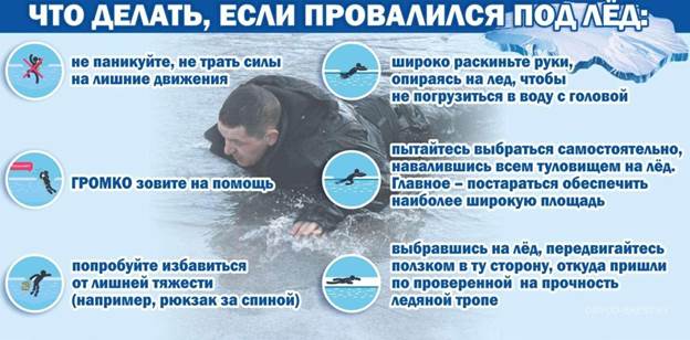 Что делать, если человек провалился под лед? – сообщите пострадавшему криком, что идете ему на помощь, это придаст ему силу, надежду, уверенность; – приближайтесь к пострадавшему только лежа, чтобы не провалиться самому; – в качестве спасательных средств используйте доски, шесты, щиты, веревки, лыжи, связанную одежду, ремни и т.д.;
